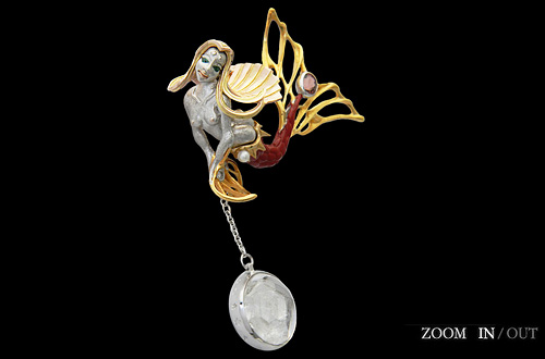 Broach / silver 925, quartz on quartz, tourmaline, moon stone, emerald, pearl